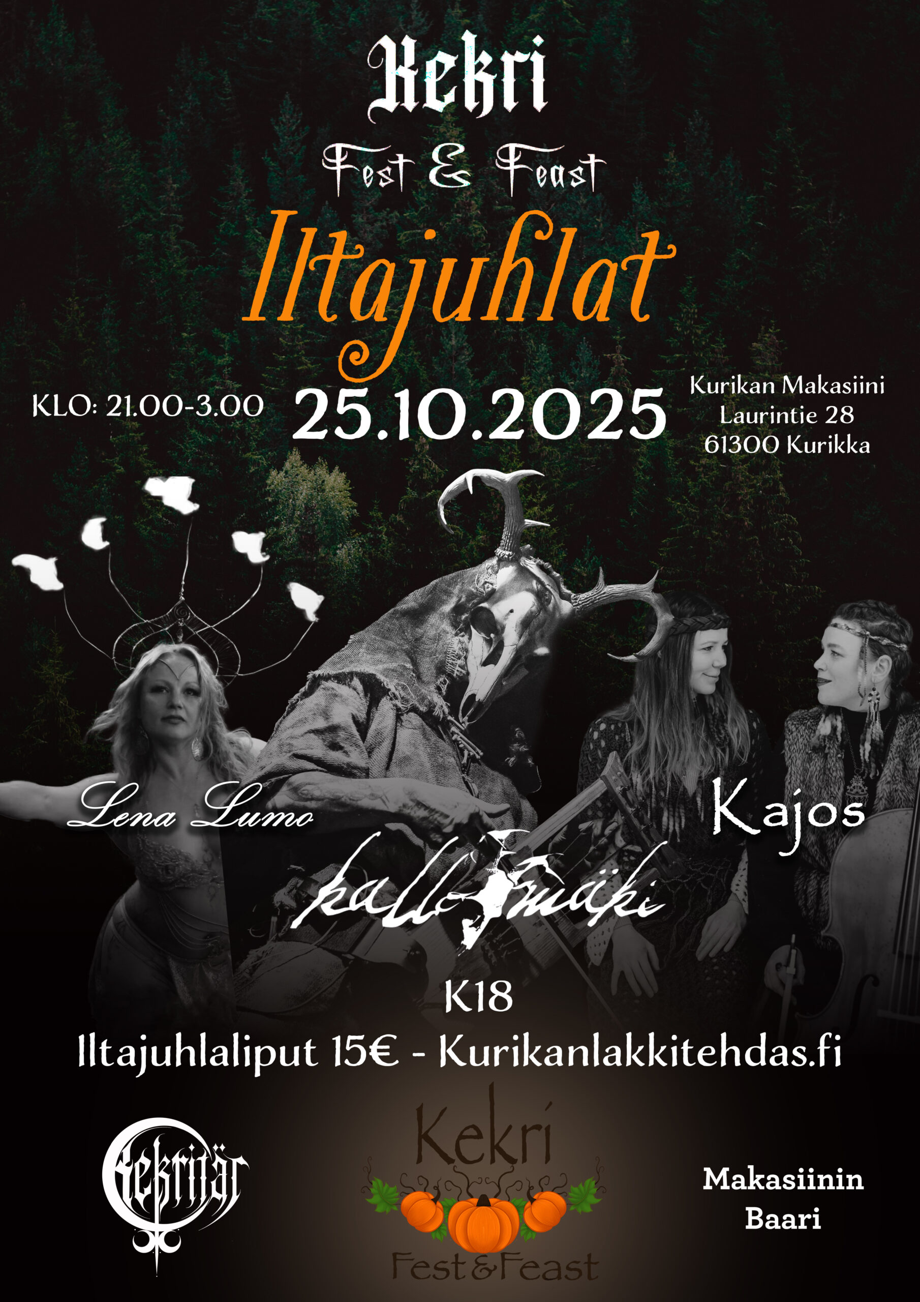 Makasiinin BaariKekri Fest & Feast palaa jälleen Kurikan Makasiinilla. Tule kokemaan täysin erilainen päivä kekrimyyjäisten maagisessa ilmapiirissä, syömään kekrilounas ja juhlimaan kanssamme pilkkuun asti iltajuhlassa.
